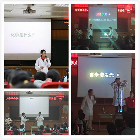 下午3:30,科普活动正式开始。赵修毅老师的科普讲座首先登场,赵老师通过深入浅出的讲解,向小学生们介绍了化学基础知识,引导孩子们思考身边的化学现象。接着,林志强、侯雅君老师演示了几个化学小实验:绚烂夺目的“焰色反应”、瑰丽幽深的“鲁米诺荧光”、神奇往复的“碘钟脉动”,现场的师生发出一阵阵的惊叹,将活动推向首个高潮。