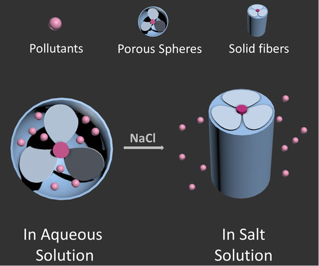近日,中山大学化学学院黄哲钢教授课题组以咔唑为中心,在其2,7,9号为分别进行芳基化,制备了新型的二维、三维的螺旋桨状芳香性两亲物, 并通过折叠芳香性平面的组装制备了空心球。与传统的基于一维芳香性分子的超分子多孔材料相比,二、三维π-共轭组装体在水溶液中提供了疏水性碳环境,可以吸附回收水中的有机污染物。研究结果表明,制备的介孔球对有机污染物—乙炔雌二醇(Eo)和双酚A(BPA)的回收率分别为92%和90%。值得注意的是,介孔球可以识别盐的浓度。随着盐的加入,折叠的芳香性分子被观察到逐渐变得平坦,诱导强的π-π相互作用,使多孔球体融化并相连一起形成实心的纤维。这种多孔向无孔材料的转变引发被吸附的污染物从多孔结构中自发释放,而随后的透析使超分子多孔结构恢复吸附容量。