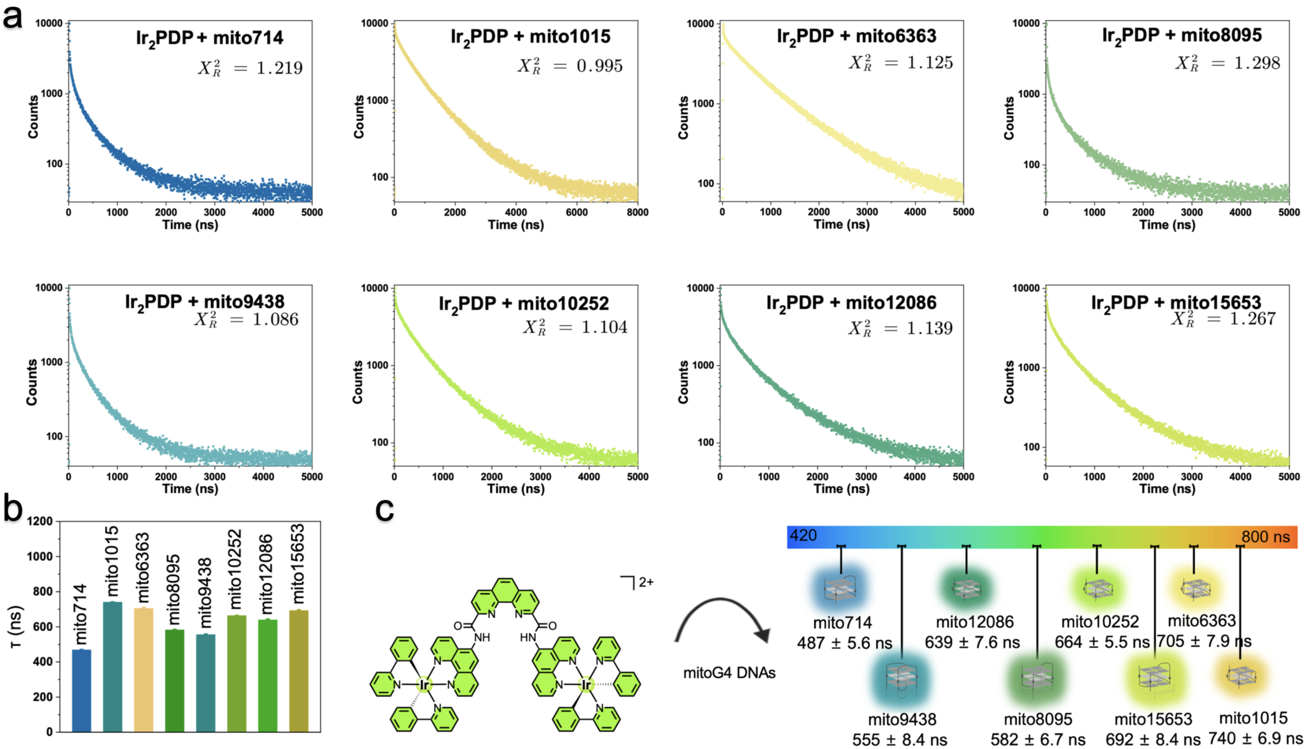 图5. Ir2PDP与不同mitoG4 DNA序列结合后的磷光寿命变化检测。(a)磷光寿命衰减曲线。(b) 磷光寿命统计结果。(c) Ir2PDP通过磷光寿命区分不同mitoG4 DNA序列示意图。