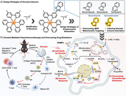 近日,中山大学巢晖教授团队设计开发了一类线粒体靶向的铱(III)基免疫原性胀亡诱导剂。该类诱导剂不仅能有效突破肿瘤多药耐药瓶颈,还可通过激活机体免疫系统,实现化疗与免疫治疗的协同增效,为癌症治疗提供了新策略(图 1)。研究表明,这类铱(III)基配合物具备多重优势:其一,可通过原位可视化实现细胞内定位追踪,同时显著克服顺铂、阿霉素等临床常用化疗药物的耐药性局限;其二,能高效诱导免疫原性细胞死亡(ICD),并协同激活 cGAS-STING 通路,成功构建 “化疗杀伤–免疫激活” 的协同治疗模式。从作用机制来看,配合物能快速靶向肿瘤细胞线粒体,破坏其结构完整性,同时升高细胞内氧化应激水平、促进钙离子(Ca2+)释放。这一系列变化会进一步激活Calpain和Porimin蛋白,最终在多药耐药肺癌细胞(A549R)中启动胀亡通路。此外,转录组学分析证实,其还能通过重组肌动蛋白细胞骨架、调节 ABC 转运蛋白活性、重塑糖酵解与糖异生代谢途径。