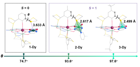 近期,该团队选用刚性的[15-MCNi-5]金属冠醚以及具有σ键旋转潜力的轴向配体对稀土离子进行封装,合成了一系列具有强磁各向异性和精确自旋排列的多自旋单分子磁体{Ln[15-MCNi-5](RDDTP)} (R = H, 1-Ln; R= Me, 2-Ln; R = tBu, 3-Ln; Ln = Dy, Y)。轴向配体取代基的立体电子效应使Ni1位点上方的二硫戊环烷基产生可控的C(sp2)–C(sp3σ键旋转。随着取代基电子效应的增强,配体的扭转角逐渐增大,使得Ni1···S1距离逐步缩短,Ni1位点呈现出可变的四配位、六配位和五配位的环境。磁性测试表明Ni1位点环境影响其磁各向异性和自旋态,导致1~3-Dy呈现出差异显著的磁滞回线。